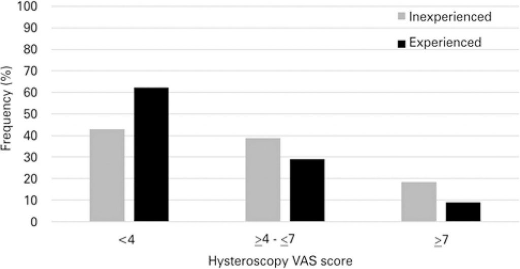 Hysteroscopy median (25th to 75th) Visual Analog Scale scored 3.3 (3 to 5), and 41.7% of the women referred Visual Analog Scale score ≥4. Median (25th to 75th) State-Trait Anxiety Inventory score was 42 (38 to 45), and 58.3% of the women referred State-Trait Anxiety Inventory score >40. Hysteroscopy Visual Analog Scale score was significantly correlated to surgeon experience and to vaginal speculum insertion but not to State-Trait Anxiety Inventory score, ethnicity or abnormal hysteroscopic findings.