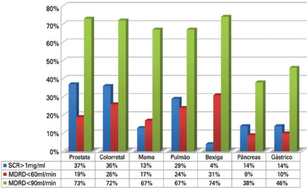 To the best of our knowledge, this was the first study to estimate the frequency of renal insufficiency in elderly cancer patients in Brazil. The prevalence of abnormal renal function among our cohort was high. As suspected, the absolute creatinine level does underestimate renal function impairment and should not be used as predictor of chemotherapy metabolism, excretion and consequent toxicity.