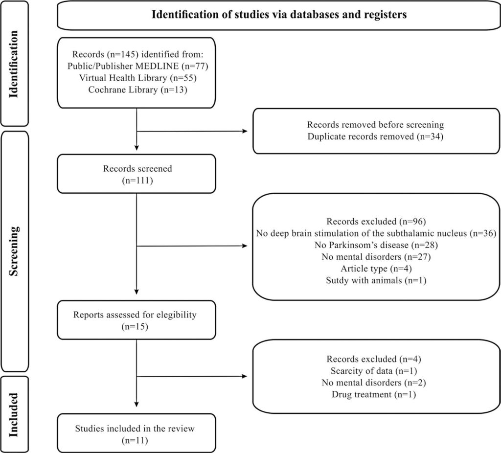 Eleven studies were included in the analysis. Manic syndrome alone was reported in two of the 11 studies analyzed. Psychosis alone was not reported in any of them, but it was found in association with other psychiatric alterations in two studies, not including manic syndrome. In one case report, hypersexuality was associated with depression and self-alienation. Depressive disorder was the most frequent psychiatric disorder after deep brain stimulation of the subthalamic nucleus, according to five of the reviewed articles, encompassing 26 patients. In four of these articles, depression was associated with other psychiatric disorders, such as psychosis, suicidal ideation, hypersexuality, and anxiety. Hypomanic syndrome was reported in two cases.