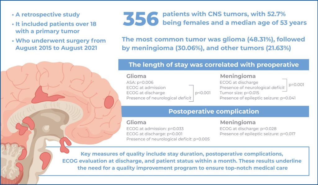 The results showed that 48% of the patients had gliomas, whereas 30 and 21.6% had meningiomas and other types of tumors. Quality measures showed that 35% of the patients with grade 2-4 tumors had multidisciplinary care plan discussions. All patients with gliomas underwent molecular testing and those eligible who underwent chemotherapy were educated and provided informed consent. Postoperative magnetic resonance imaging within 72h was performed in 87% of gliomas. The length of hospital stay, postoperative complications, Eastern Cooperative Oncology Group status at discharge, and 30-day status were also potential quality measures. However, for meningioma cases, readmissions were associated with patients in the American Society of Anesthesiologists II (58.33%) and American Society of Anesthesiologists III-IV (41.67%).