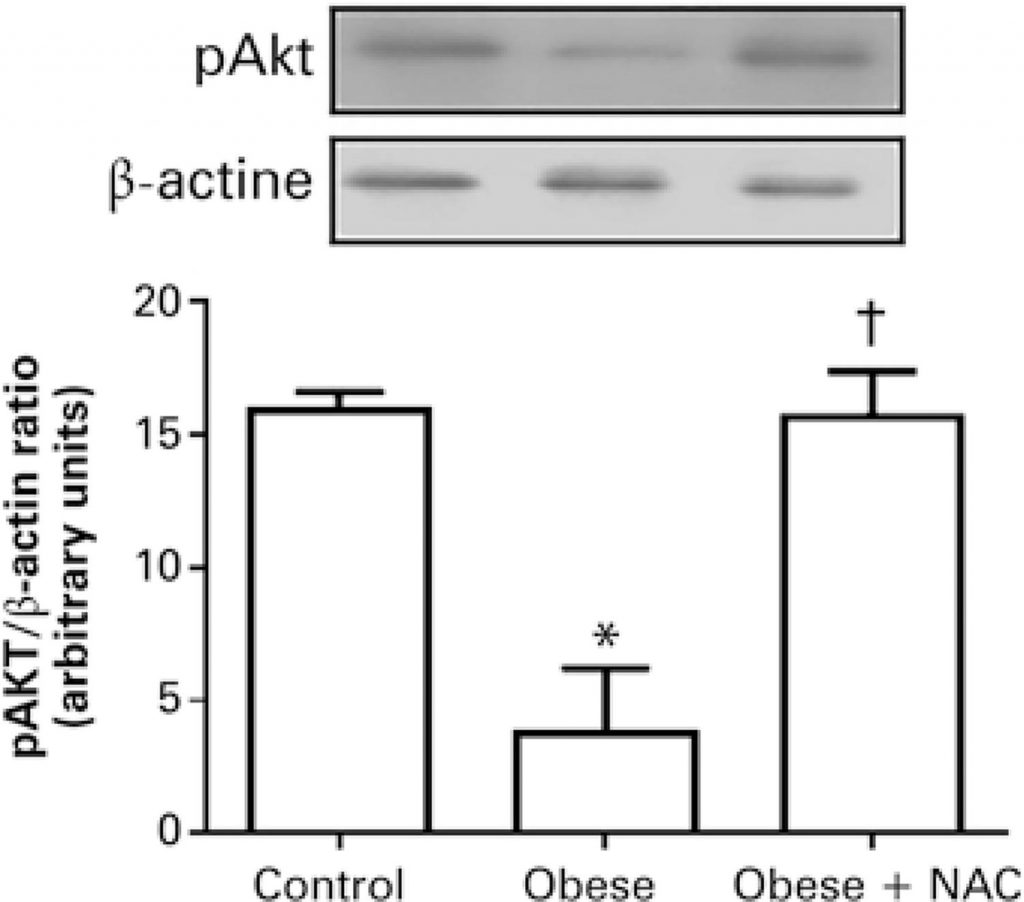 Higher blood glucose levels and nitrite and carbonyl contents, and lower protein levels of glutathione peroxidase and phosphorylated protein kinase B were observed in the obese group when compared with their respective control. On the other hand, treatment with N-acetylcysteine was effective in reducing blood glucose levels and nitrite and carbonyl contents, and significantly increased protein levels of glutathione peroxidase and phosphorylated protein kinase B compared to the Obese Group.