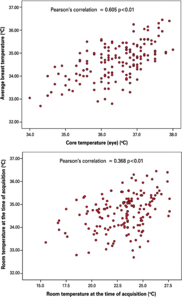 We performed 180 observations and the core temperature had the highest correlation with the breast temperature, followed by room temperature. The proposed prediction model could explain 45.3% of the breast temperature variation, with variable room temperature variable; it can be accepted as a way to estimate the reference breast temperature at different room temperatures.