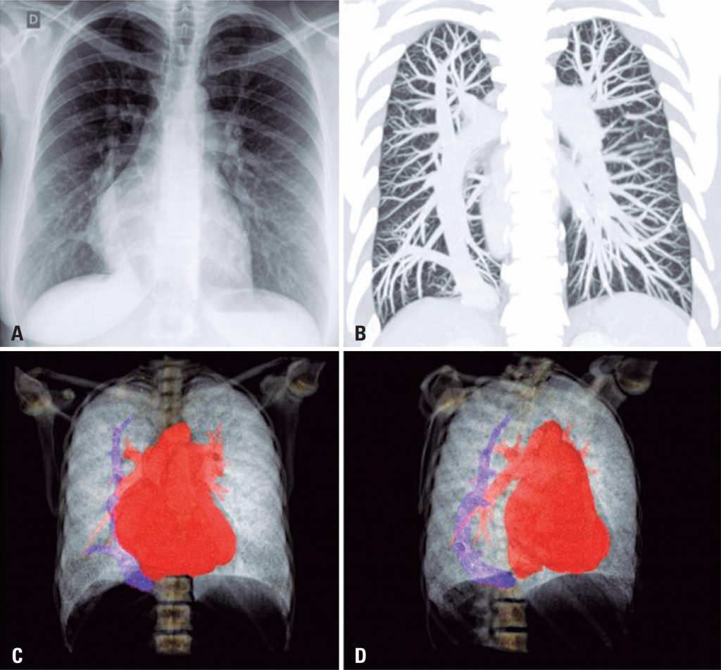 A 34-year-old patient with a history of asthma, taking inhaled corticosteroids and bronchodilators, presented with worsening dyspnea (functional class III) and reports of syncope. On physical examination, pulmonary auscultation was normal with pulse oximetry of 96% in room air. On cardiac auscultation, the rhythm was regular with fixed splitting S2 and systolic murmur 2+/6+ on left sternal border. On abdominal examination, the liver was palpable 2cm below the right costal border. There were no other signs of heart failure. Chest radiography was performed during the investigation, which showed a calibrous tubular structure slightly arched towards the right atrium and part of the cardiac area occupying the right hemithorax ( ). Chest CT scan revealed a large caliber anomalous vein in the right lung, draining into the cavoatrial junction ( ). Three-dimensional computed tomography scan using intravenous contrast showed a thick anomalous vein arched along the craniocaudal axis of the right lung, draining into the cavoatrial junction, compatible with scimitar ( and ).