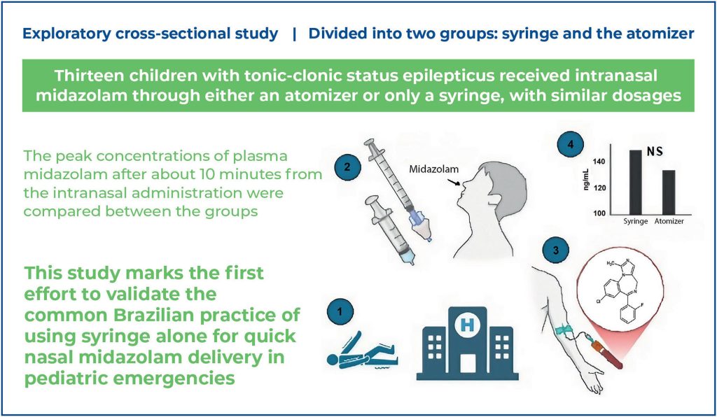This exploratory cross-sectional study was conducted between January 2022 and March 2024 at the emergency department of a hospital in Southern Brazil. Thirteen children with tonic-clonic status epilepticus received intranasal midazolam via either an atomizer or syringe, at similar dosages. The peak plasma midazolam concentrations, measured approximately 10 min following intranasal administration, were compared between the groups.