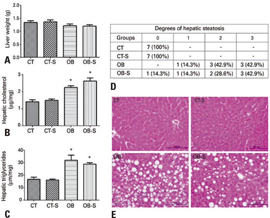 Obese mice experienced significantly greater weight gain and fat accumulation and had higher total cholesterol and glucose levels compared to controls. Retroperitoneal and periepididymal adipocyte hypertrophy, development of hepatic steatosis, increased cholesterol and triglyceride levels and morphometric changes in the jejunal wall were observed.