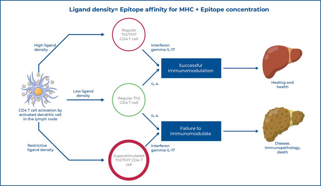 Results showed that strong immunodominance of a single egg epitope undermines effective CD4+ T-cell modulation, promoting a strongly polarized Th1/Th17 pathogenic response. Conversely, neutralizing this immunodominance produces the opposite restorative effect.