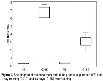 OBJECTIVE: The hippocampus has an important role in the acquisition and recall of aversive memories. The objective of this study was to investigate the relationship among hippocampal rhythms. METHODS: Microeletrodes arrays were implanted in the hippocampus of Wistar rats. The animals were trained and tested in a contextual fear conditioning task. The training consisted in applying shocks in the legs. The memory test was performed 1 day (recent memory) or 18 days (remote memory) after training. We proposed a measure based on the FFT power spectrum, denominated “delta-theta ratio”, to characterize the different behaviors (active exploration and freezing) and the memories types. RESULTS: The delta-theta ratio was able to distinguish recent and remote memories. In this study, the ratio for the 18-day group was smaller than for the 1-day group. Moreover, this measure was useful to distinguish the different behavior states – active exploration and freezing. CONCLUSIONS: The results suggest delta-theta oscillations could reflect the demands on information processing during recent and remote memory recalls.