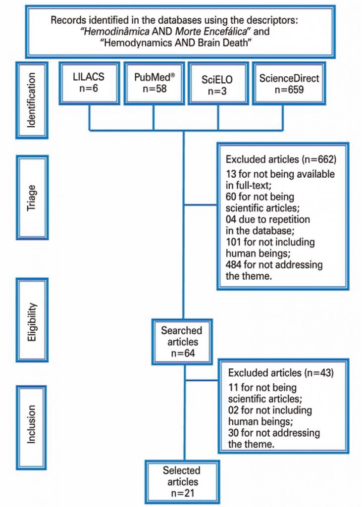 Integrative review with articles published between 2007 and 2019, in Scientific Electronic Library Online (SciELO), Latin American and Caribbean Health Sciences Literature (LILACS), PubMed® and ScienceDirect. The descriptors “ Hemodinâmica AND Morte Encefálica ” and “Hemodynamics AND Brain Death” were used. Exclusion criteria were non-human research and gray literature.