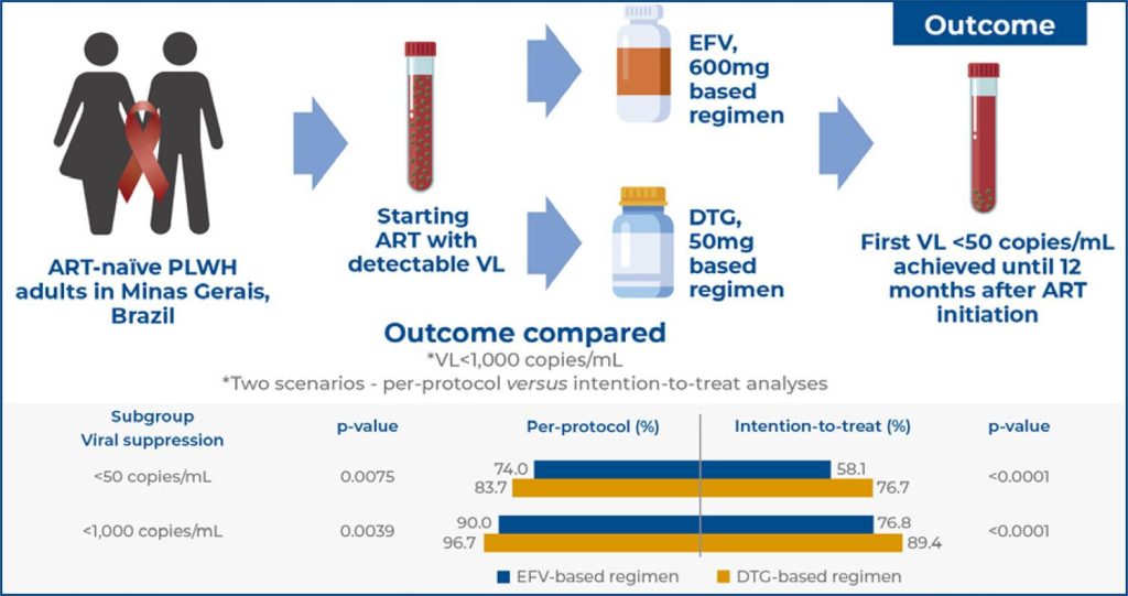 Of the 2,599 participants enrolled, 77.5% were men, and the median age was 34 years. In the intention-to-treat analysis, viral suppression was 58.1% for efavirenz and 76.7% for dolutegravir. People living with HIV on dolutegravir-based regimen were more likely to achieve viral suppression (aOR: 2.44; 95%CI: 2.01-2.95) and had a shorter median time to viral suppression (p<0.0001). Antiretroviral therapy initiation within <120 days, baseline CD4⁺T-cells ≥200 cells/mm3, and viral load <100,000 copies/mL had higher odds of viral suppression. According to the per-protocol analysis, viral suppression ≥90% was observed by considering viral load <1,000 copies/mL.