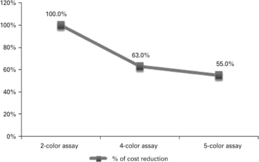 Activity-based costing. Paroxysmal nocturnal hemoglobinuria test cost reduction was associated with technical procedures. The two-color assay was taken as the starting point for comparative analysis of technical procedures in this study (two tubes four-color and single tube five-color assays)