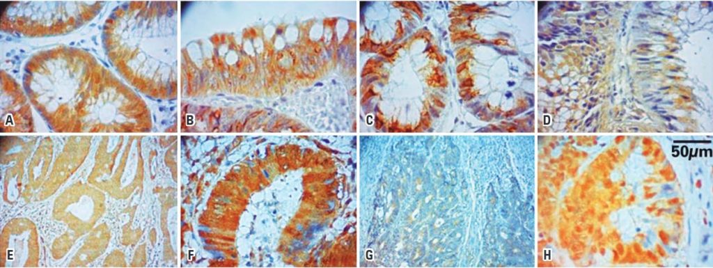 Tissue samples from 64 patients with colorectal carcinoma and 53 patients with colonic adenoma were analyzed. Tissue microarray blocks and slides were prepared and subjected to immunohistochemistry with polyclonal antibodies in carcinoma, adjacent non-neoplastic mucosa, and adenoma tissues. The immunoreactivity was evaluated by the percentage of positive stained cells and by the intensity assessed through of the stained grade of proteins in the cytoplasm and nucleus of cells. In the statistical analysis, the Spearman correlation coefficient, Student’s t, χ2, Mann-Whitney, and McNemar tests, and univariate logistic regression analysis were used.