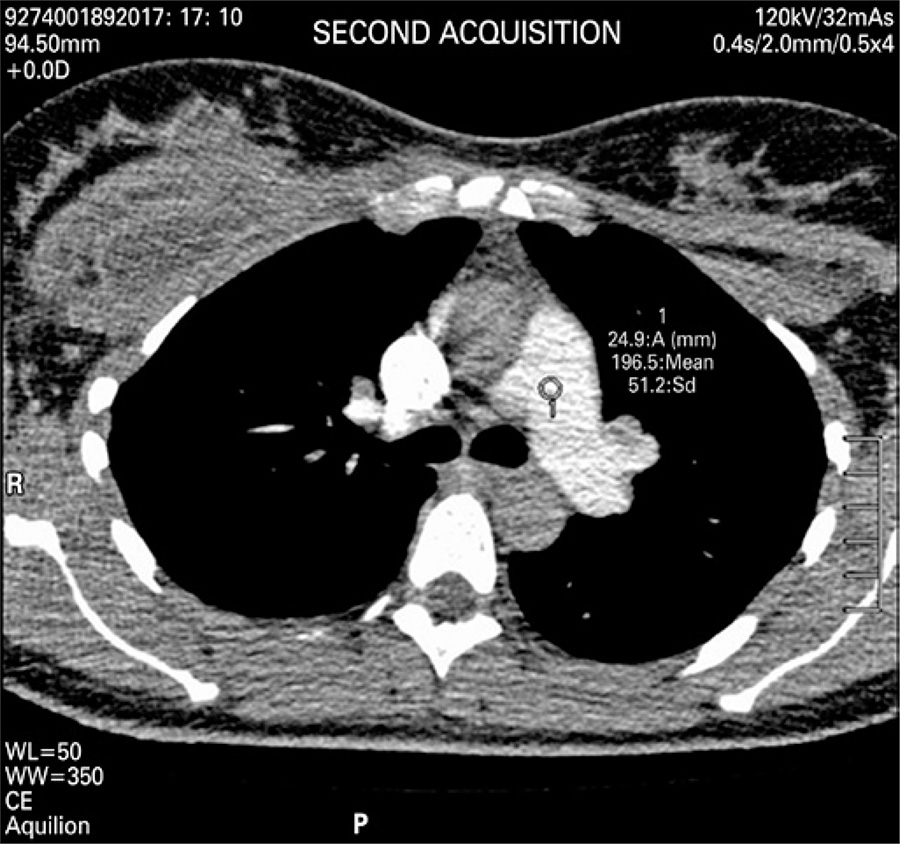 This was 37-year-old woman, 10 days after surgery, who underwent breast prosthesis replacement, abdominoplasty and liposuction. Upon admission, she was hemodynamically stable, febrile and reported constant pain on left hemithorax region, but without dyspnea.