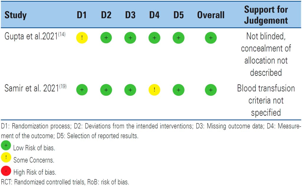 We searched registers with MESH terms “prostate hyperplasia,” “prostate surgery,” and “tranexamic acid.” Studies available in full and online, published from 2013 to 2023, in Portuguese, English, Spanish, and French were included; review articles were excluded. Information sources: Portal Regional da Biblioteca Virtual em Saúde and PubMed Central. The Cochrane RoB2 tool was used to analyze risk of bias in randomized clinical trials.