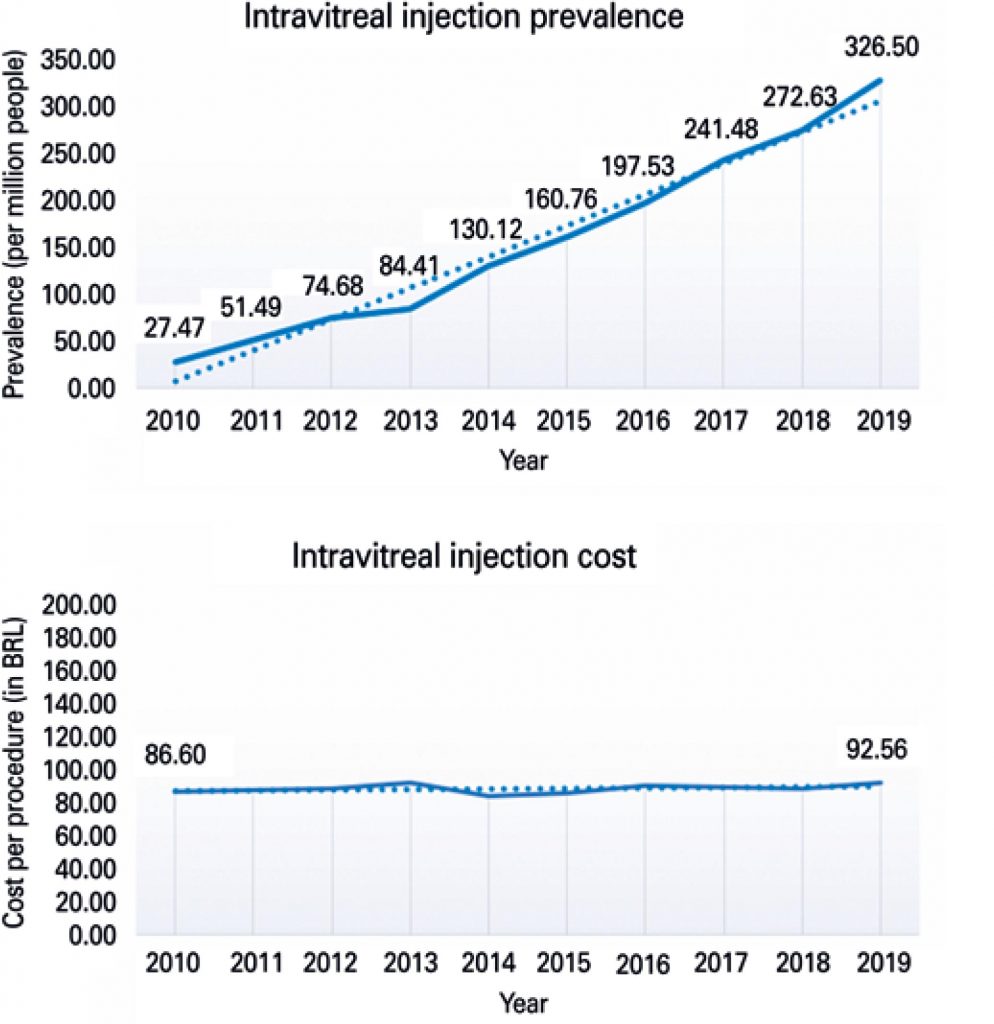 The Brazilian Public Health System Database was used as the primary source of data. Intravitreal injection, photocoagulation and panphotocoagulation procedures performed from 2010 to 2019 were investigated. Procedure prevalence and cost trends were analyzed according to year and region. Annual trends were examined using generalized linear models, with a significance level of 5% (p=0.05).