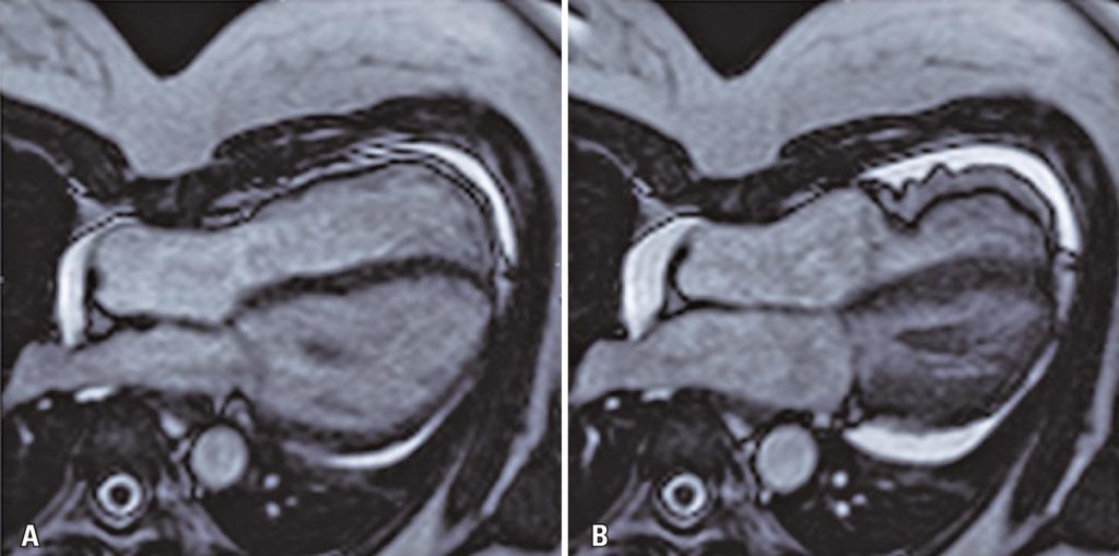 Cardiac magnetic resonance imaging was performed for proper evaluation of the right ventricle. Cardiac magnetic resonance showed normal biventricular function; however, tricuspid valve prolapse and tricuspid annulus disjunction were observed (maximum separation between the tricuspid valve and the free wall of the right ventricle was 5mm) ( ), along with pectus excavatum and mild pericardial effusion. Late gadolinium enhancement sequences revealed non-myocardial fibrosis ( ).