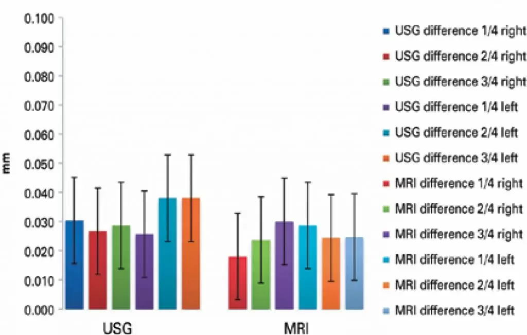A prospective single-center study involving 30 volunteers with no elbow joint changes. Two experienced ultrasound specialists evaluated both elbows of each volunteer, resulting in 60 evaluations per physician and totaling up 120 evaluations. Magnetic resonance images were obtained using a 3-Tesla machine and evaluated by two experienced radiologists, totaling up 120 exams. Each examiner assigned subjective, zero-to-5 scores to ligaments imaged, where zero corresponded to non-identified ligament and 5 to visualization of the entire ligament. The level of significance was set at 5%. Bland-Altman dispersions and plots were prepared for each pair of measurements obtained.