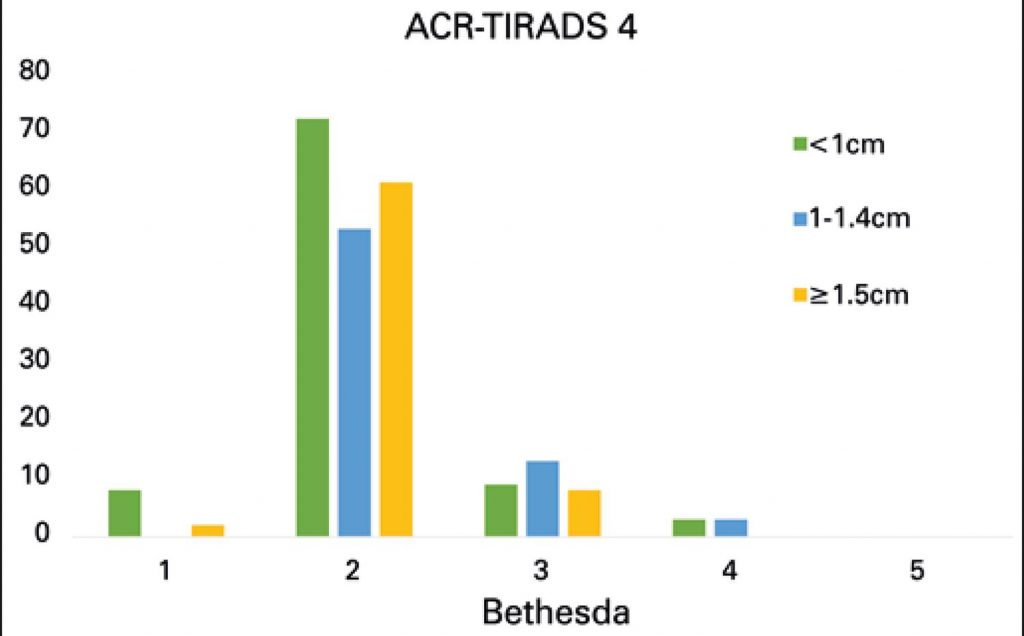 Most nodules in both ACR-TIRADS classifications fell in the Bethesda 2 category, regardless of size (90.8% and 68.6%, ACR-TIRADS 3 and 4 respectively). The prevalence of Bethesda 6 nodules in the ACR-TIRADS 4 group was 14 times higher than in the ACR-TIRADS 3 group. There were no significant differences between nodule size and fine needle aspiration biopsy classification in any of the ACR-TIRADS categories.