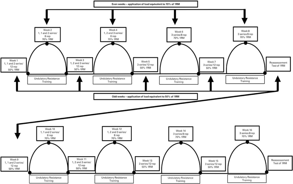 Undulatory resistance training used with weekly different overloads was effective to provide significant gains in maximum strength in elderly type 2 diabetic individuals.