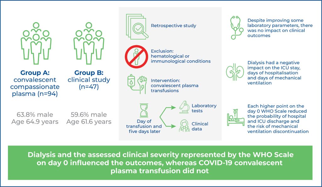 This retrospective study was conducted at a tertiary hospital in São Paulo, Brazil. We included a retrospective cohort of patients who received convalescent compassionate plasma, and another group of patients from a previous clinical study. We collected clinical and laboratory data on the day of and 5 days after transfusion. Patients with hematological or immunological conditions were excluded. Statistical significance was set at p<0.05.
