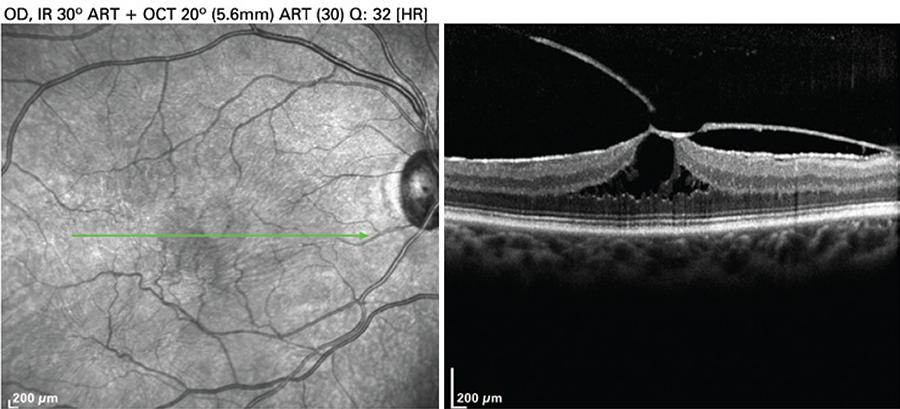 Upon examination her best-corrected visual acuity was 20/80 in the RE and 20/20 in the left eye. Funduscopy showed vitreous condensation in fovea region of the RE. Optical coherence tomography (OCT) showed vitreomacular traction due to partial posterior vitreous detachment that disorganized the fovea structure and formed an aspect of “camel-hump” associated with the presence of high-reflectivity membrane, generating moderate centripetal traction of the retina surface with preservation of external and internal lines of photoreceptors ().