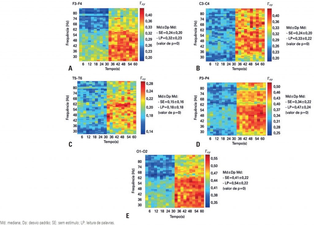 Foram avaliados 96 sinais eletroencefalográficos medidos em voluntários neurologicamente saudáveis, em dois momentos: repouso e leitura de palavras. Cada trecho do sinal foi mensurado por três quantificadores que medem, de maneira isolada, a potência normalizada e a potência percentual, bem como a coerência entre os hemisférios direito e esquerdo. O teste estatístico de Mann-Whitney foi usado para comparar os resultados dos quantificadores em cada faixa cerebral.