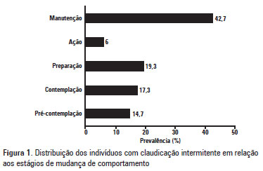 OBJETIVO: Analisar, em pessoas com claudicação intermitente, a frequência de indivíduos que está em cada um dos estágios de mudança de comportamento para a prática de atividade física bem como a relação desses estágios com a capacidade de caminhada. MÉTODOS: Foram recrutados 150 indivíduos com claudicação intermitente atendidos em um centro terciário, sendo incluídos aqueles com idade >30 anos e índice tornozelo braço