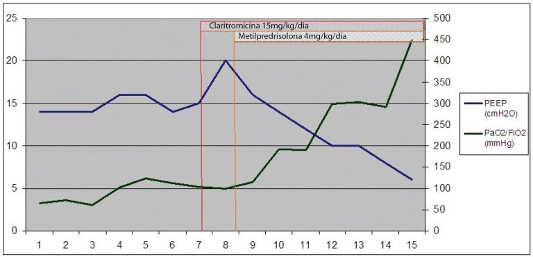 RESUMO Mycoplasma pneumonia é reconhecido como um importante agente causador de pneumonia em crianças. Raramente pode evoluir para lesão pulmonar grave. O uso de corticoide nesses casos ainda é controverso. Descrevemos aqui o caso de uma menina com síndrome do desconforto respiratório agudo e derrame pleural bilateral secundário à pneumonia por Mycoplasma pneumoniae com boa recuperação após utilização de metilprednisolona e claritromicina.