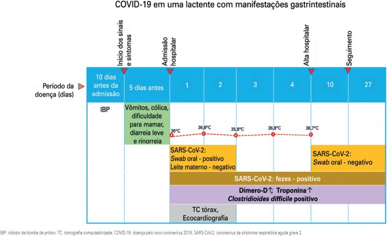 RESUMO Relatamos o caso clínico de uma lactente com infecção por coronavírus da síndrome respiratória aguda grave 2 (SARS-CoV-2) com sinais e sintomas gastrintestinais – predominantemente vômitos. A paciente apresentou, adicionalmente, cólica, dificuldade para mamar, evacuações amolecidas e rinorreia leve, sem febre. Houve evidências de alterações da coagulação, aumento de interleucina 10 e desidratação moderada, que justificaram internação na unidade de terapia intensiva. Simultaneamente, a paciente foi diagnosticada com infecção por Clostridioides difficile , que pode ter facilitado a persistência […]
