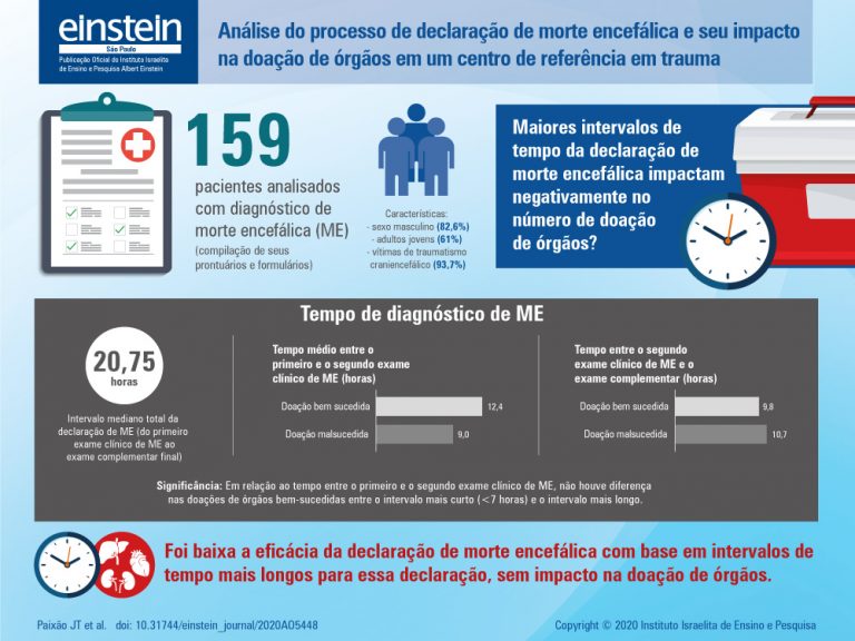 RESUMO Objetivo Caracterizar os processos de diagnóstico de morte encefálica e doação de órgãos em um centro de referência de trauma. Métodos Estudo observacional e transversal com pacientes notificados com morte encefálica em um centro de referência de trauma. Os dados foram obtidos por meio da coleta de prontuários e formulários de declaração de morte encefálica. Resultados Foram notificados com morte encefálica 159 pacientes, com prevalência do sexo masculino (82,6%), adultos jovens (97,61%) e vítimas de traumatismo craniencefálico (93,7%). A […]