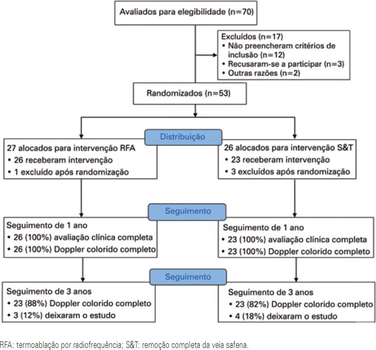 Ensaio clínico randomizado prospectivo comparando a ablação por radiofrequência e a retirada completa de veia safena em pacientes com doença venosa crônica leve à moderada com seguimento de 3 anos