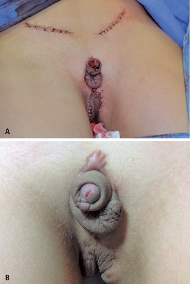RESUMO O pênis ectópico geralmente ocorre associado à transposição peno-escrotal, sendo raro isoladamente. Relatamos uma abordagem cirúrgica para um caso extremamente raro. Tratava-se de paciente do sexo masculino, 10 anos, com criptorquidia bilateral e pênis e escroto ectópicos, na região perineal, sem transposição peno-escrotal, representando uma associação ainda não descrita na literatura. Orquidopexia prévia sem sucesso, devido à ectopia do escroto. Por meio de uma incisão em Y invertido, mobilizou-se o pênis e preparou-se um retalho da pele perineal em […]