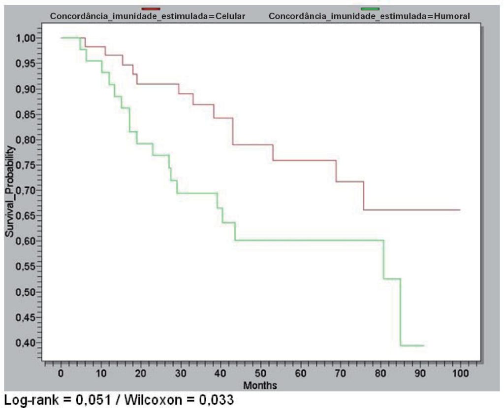 houve correlação positiva entre o padrão de estímulo da imunidade celular e o aumento da sobrevida em cinco anos em paciente pN0 com carcinoma epidermoide de laringe sugerindo a indicação de tratamento adjuvante em casos que apresentarem diminuição da imunidade celular mesmo na ausência de metástases patológicas detectadas pelos métodos habituais.