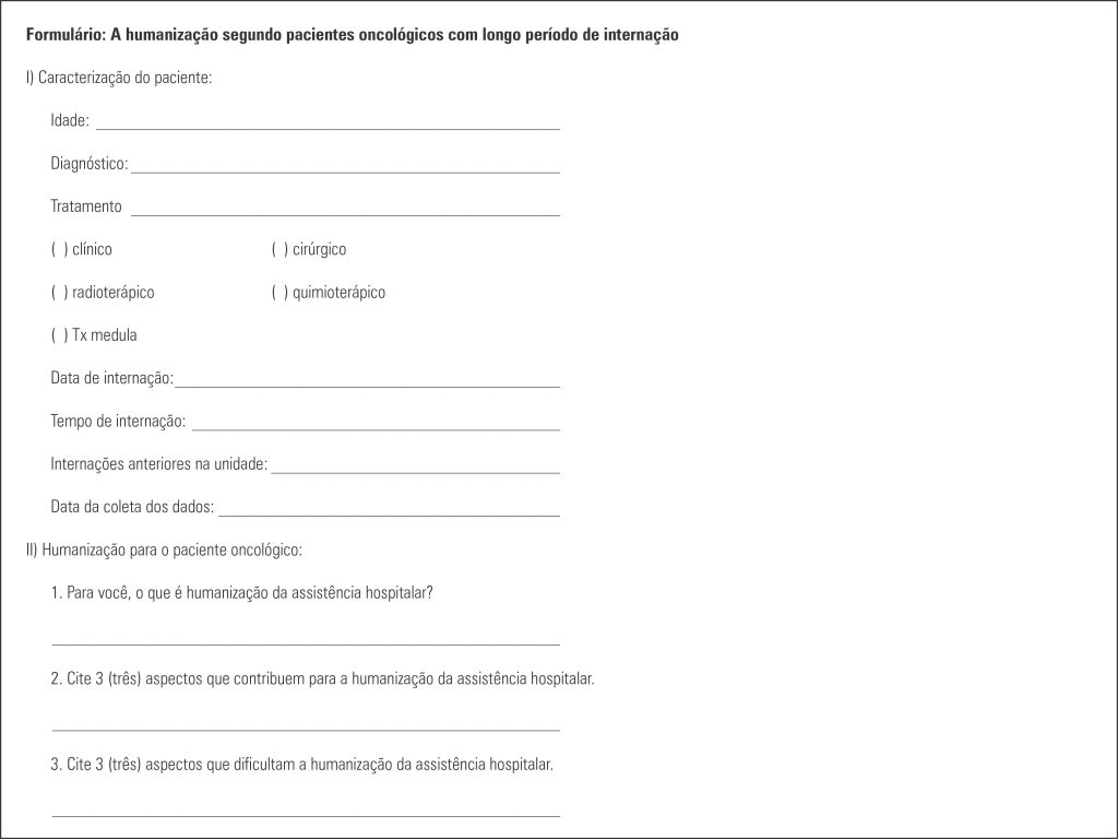 Trata-se de uma pesquisa descritivo-exploratória, prospectiva, com abordagem quali-quantitativa. A amostra constituiu-se de 10 pacientes internados há mais de 30 dias na unidade de Oncologia do Hospital Israelita Albert Einstein, que, depois de cumpridos os devidos procedimentos ético-legais, foram entrevistados e responderam a três perguntas referentes à humanização em oncologia.