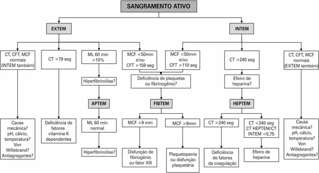 A hemorragia grave com necessidade de transfusão de sangue e componentes é uma complicação frequente na unidade de terapia intensiva e está associada ao aumento da morbidade e da mortalidade. A identificação adequada e o tratamento precoce da causa específica da coagulopatia tornam-se fundamentais para o controle efetivo da hemorragia, racionalizando a utilização de sangue e componentes, e desta forma, prevenindo a ocorrência de efeitos adversos. Testes convencionais da coagulação (tempo de ativação de protrombina e tempo de tromboplastina parcial ativada) apresentam limitações para prever sangramento e guiar a terapia transfusional em pacientes graves. Testes viscoelásticos como a tromboelastografia e tromboelastometria rotacional permitem a rápida detecção da coagulopatia e orientam a terapia de forma individualizada, alvo dirigida com drogas hemostáticas específicas. A nova era da tromboelastometria confia na sua eficácia, praticidade, reprodutibilidade e custo-eficácia para se firmar como a principal ferramenta diagnóstica e guia transfusional em pacientes com sangramento ativo grave.