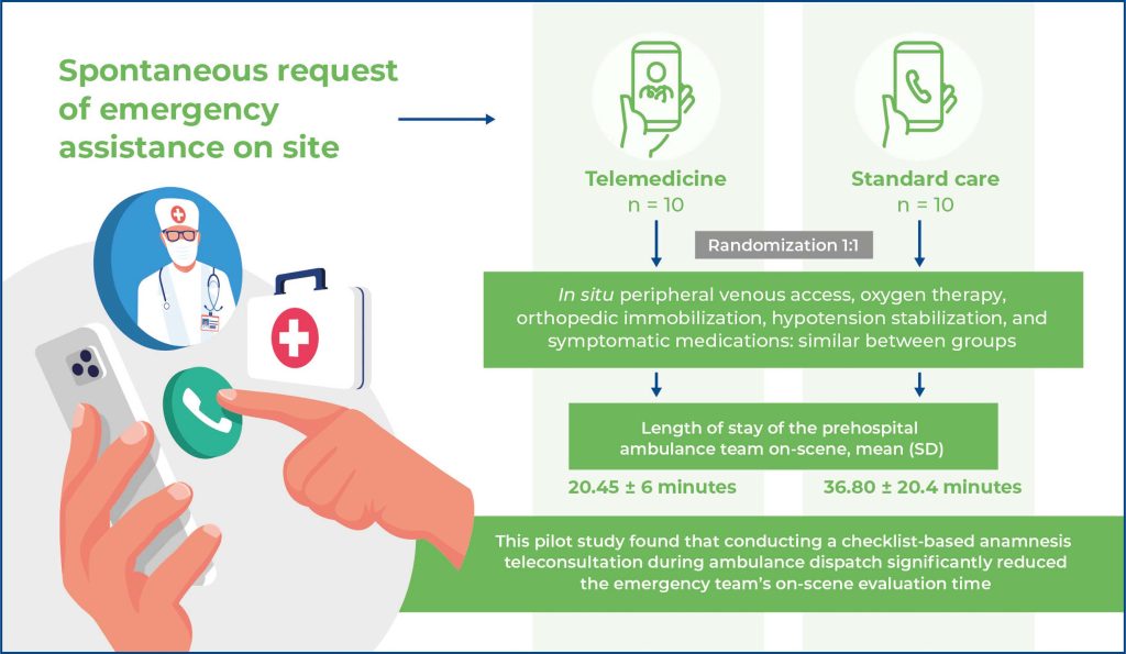 Conducting checklistbased anamnesis teleconsultation during ambulance dispatch considerably decreased the onscene evaluation time of the emergency team. Further research with larger cohorts and different settings is required to better examine telemedicine’s potential in this context.
