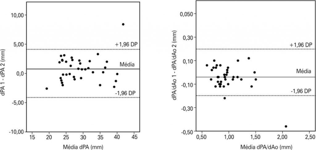 Os diâmetros da artéria pulmonar e da aorta ascendente foram altamente reprodutíveis. A associação entre diâmetro da artéria pulmonar e diâmetro da aorta ascendente >1 e/ou pressão sistólica da artéria pulmonar ≥40mmHg melhorou a sensibilidade e o valor preditivo negativo para rastreamento de hipertensão pulmonar. Essa estratégia requer validação prospectiva para se avaliarem segurança e custo-efetividade.