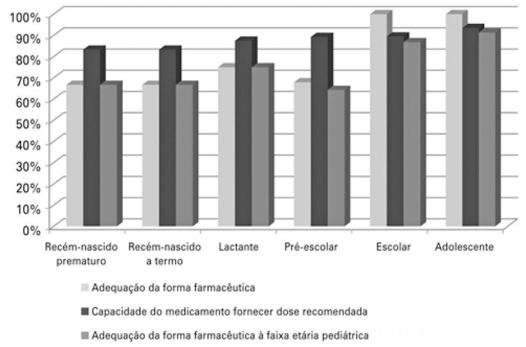 A adequação devido à capacidade do medicamento fornecer a dose recomendada foi superior a 80% em todas as faixas etárias. Em relação à adequação da forma farmacêutica, identificou-se que quanto maior a faixa etária, maior a proporção de adequação para uso pediátrico. Em relação aos medicamentos que se apresentavam em formas farmacêuticas sólidas, evidenciou-se que metade foi classificada como inadequada para uma ou mais faixas etárias pediátricas para as quais estavam indicados. A adequação dos medicamentos à faixa etária pediátrica foi 64,3% para pré-escolares, 66,7% para recém-nascidos a termo, 66,7% para recém-nascidos prematuros e superior a 70% para as demais faixas etárias.
