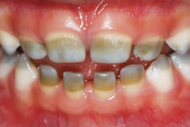 Paciente do sexo feminino, 2 anos de idade, compareceu à clínica de odontopediatria da Faculdade de Odontologia de Araraquara da Universidade Estadual Paulista “Júlio de Mesquita Filho” (UNESP), acompanhada pelo pai, com queixa de dentes manchados. Na anamnese, foi constatado que a criança nasceu na 29ª semana de gestação, pesando 1,8kg e com índice de Apgar 2 no primeiro minuto e 4 no quinto minuto, necessitando de medidas urgentes de reanimação. Apresentou ainda hipóxia, colestase neonatal, persistência do canal arterial (PCA), comunicação interventricular (CIV), anemia e sepse. Permaneceu na unidade de terapia intensiva (UTI) por 40 dias, onde foi submetida à fototerapia de alta intensidade, aliada a medicamentos para redução da produção de bilirrubina. O tratamento prosseguiu até a normalização do quadro. Exames realizados aos 3 meses de vida mostraram concentração de bilirrubina total igual a 14,9mg/dL; transaminase glutâminco oxalacética (TGO) de 178U/L e transaminase glutâmico prúvica (TGP) de 165U/L. Com 1 ano de idade, estas mostraram-se dentro dos padrões de referência, e a criança não apresentava sequelas motoras e nem intelectuais tardias.