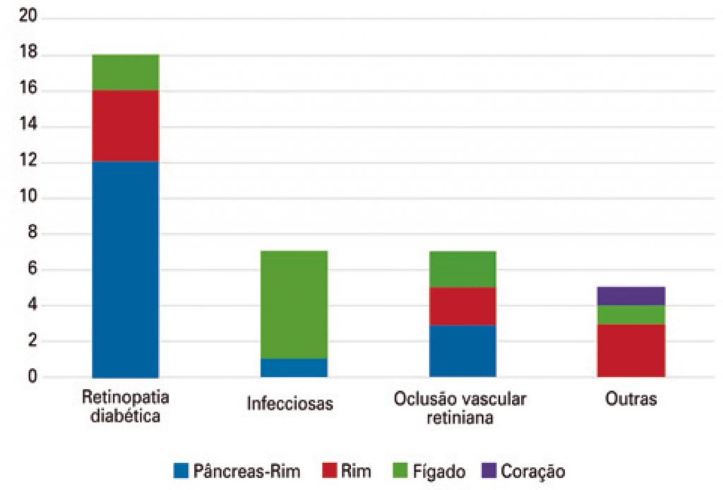 As alterações retinianas estavam relacionadas a doenças preexistentes, principalmente à retinopatia diabética, ou surgiram após o transplante, como complicação do procedimento cirúrgico, ou como complicação infecciosa associada à imunossupressão, ou ainda por toxicidade medicamentosa. Tais pacientes podem apresentar alterações oculares complexas, devendo ser submetidos à avaliação retiniana pré-operatória cuidadosa e ao acompanhamento pós-operatório por oftalmologista especializado no manejo da retinopatia diabética e de doenças infecciosas do segmento posterior ocular
