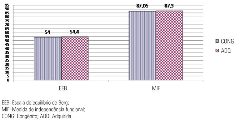 Na Escala de Equilíbrio de Berg a média do grupo com deficiência visual adquirida foi 54,0 ± 2,4 e no grupo com deficiência visual congênita foi 54,4 ± 2,5; na medida de independência funcional a média do grupo com deficiência visual adquirida foi 87,1 ± 4,8 e no grupo com deficiência visual congênita foi 87,3 ± 2,3.