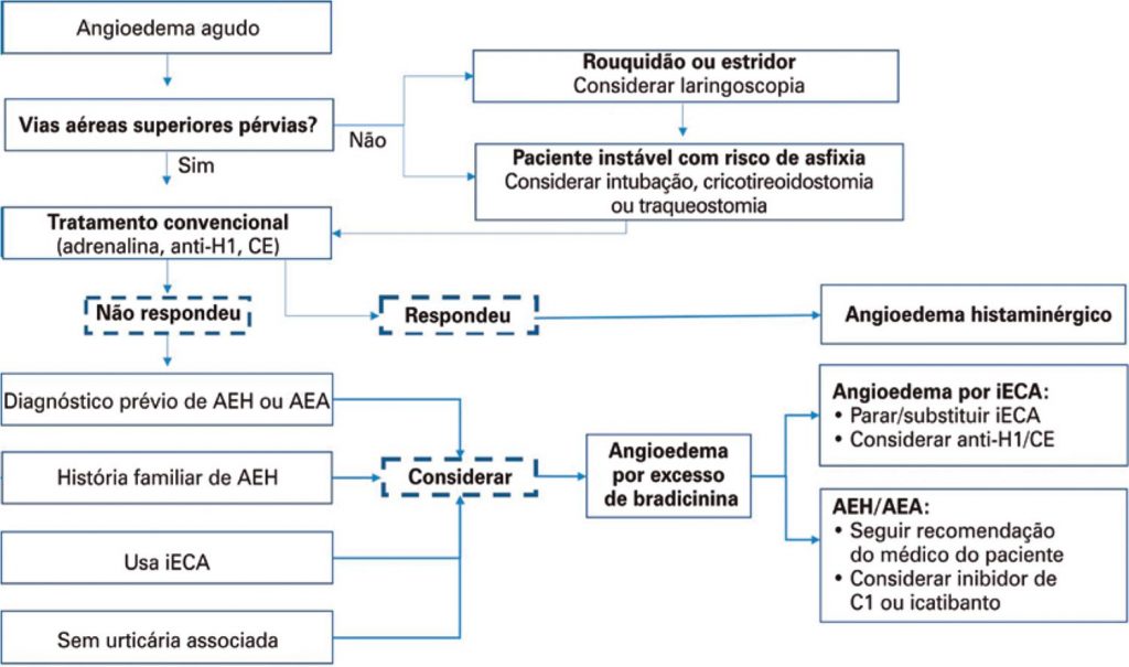 As crises de angioedema são causas comuns de atendimentos nas emergências, e devido ao potencial de gravidade, é importante que os profissionais que atuam nesses serviços conheçam suas causas e abordagem. Os mecanismos envolvidos no angioedema sem urticas podem ser histaminérgicos ou mediados por bradicinina. As causas mais comuns de angioedema mediado por histamina são alimentos, medicamentos, ferroada de insetos e idiopática. Quando o mediador é a bradicinina, os desencadeantes são os inibidores da enzima conversora de angiotensina e fatores relacionados ao angioedema adquirido com deficiência do inibidor de C1 ou angioedema hereditário que são menos comuns, mas muito importantes pela possibilidade de desfecho fatal. O angioedema hereditário é uma doença rara, caracterizada por crises de edema que acometem o tecido subcutâneo e mucosas de vários órgãos, manifestando-se principalmente por crises de angioedema e dor abdominal. Esse tipo de angioedema não responde ao tratamento usual com adrenalina, anti-histamínicos e corticosteroides. Assim, se não identificados e tratados adequadamente, esses pacientes têm risco de morte por edema de laringe estimado em 25% a 40%. O tratamento do angioedema hereditário mudou drasticamente nos últimos anos, com o desenvolvimento de novos e eficientes fármacos para as crises: inibidor de C1 derivado de plasma, inibidor de C1 recombinante humano, antagonista do receptor B2 da bradicinina (icatibanto) e o inibidor da calicreína (ecalantide). No Brasil, até o momento, estão liberados para uso o inibidor de C1 derivado de plasma e o icatibanto. O manejo correto desses pacientes na emergência evita cirurgias desnecessárias e, principalmente, desfechos fatais.