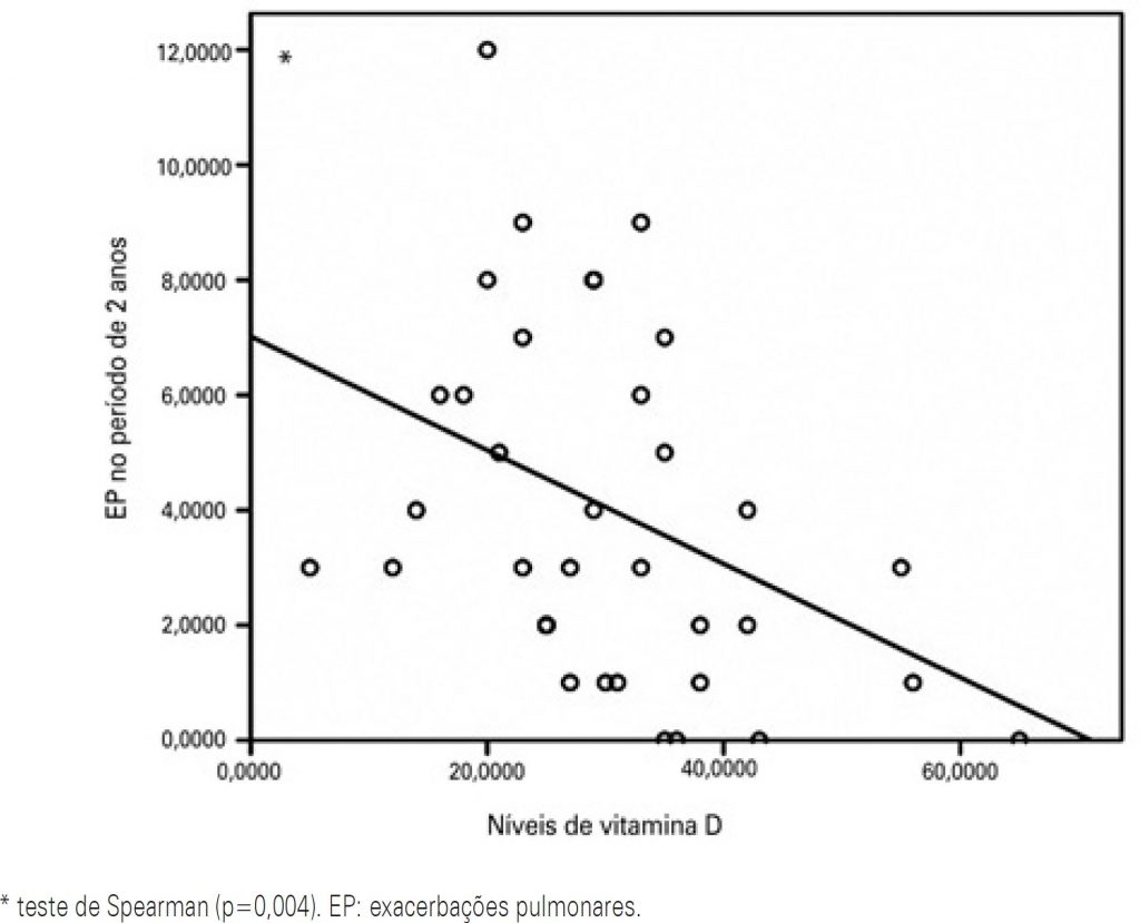 Hipovitaminose D (25(OH)D <30ng/mL) foi observada em 54% dos pacientes. O nível médio de 25(OH)D foi de 30,53±12,14ng/mL. A função pulmonar e o estado nutricional não foram associados aos níveis de vitamina D. As exacerbações pulmonares durante um período de 2 anos (p = 0,007) e do período de medição até o final do período de seguimento (p=0,002) foram significativamente associadas aos níveis de vitamina D.