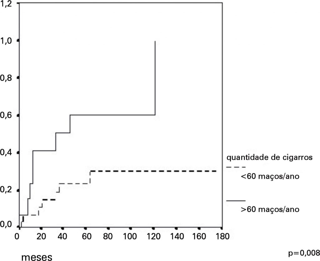 O tabagismo foi mais comum entre os homens (p = 0,03), sendo que 62,6% do total de pacientes avaliados eram tabagistas. O diagnóstico do câncer ocorreu em uma idade mais precoce entre os tabagistas (70,8 versus 64,8 anos, p = 0,03). Observou-se uma progressão significativamente maior para doença invasiva entre os pacientes com carga tabágica acima de 60 maços/ano (52,9 versus 26,2%, p = 0,037). Estes pacientes tiveram um tempo de progressão de 59,3 versus 131,8 meses para aqueles com menor carga tabágica.
