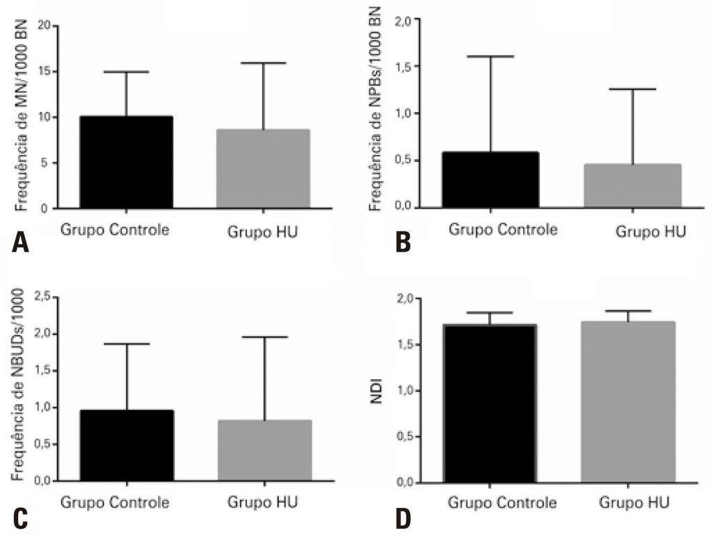 Os pacientes com doença falciforme tratados com hidroxiureia apresentaram média de idade de 25,4 anos, enquanto aqueles com doença falciforme não tratados com hidroxiureia tiveram média de idade de 17,6 anos. A dose média de hidroxiureia utilizada pelos pacientes foi de 12,8mg/kg/dia, por período médio de 44 meses. A frequência média de micronúcleos por 1.000 células de 8,591±1,568 foi observada no Grupo Hidroxiureia e de 10,040±1,003 no Grupo Controle. Adicionalmente, a frequência média de pontes nucleoplasmáticas por 1.000 células e brotamento nuclear por 1.000 células para o Grupo Hidroxiureia e Controle foi de 0,4545±0,1707 versus 0,5833±0,2078, e de 0,8182±0,2430 versus 0,9583±0,1853, respectivamente. Não houve diferença estatisticamente significativa entre os grupos.