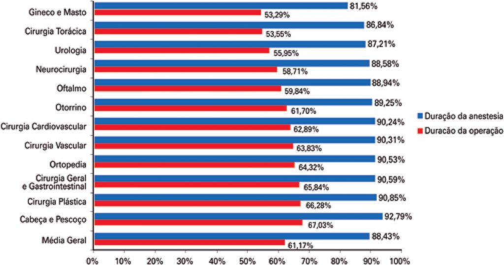 O estudo incluiu 8.337 operações realizadas no período de 1 ano de 12 especialidades cirúrgicas. A média geral da duração da anestesia de todas as especialidades foi de 178,12±110,46 minutos, e o percentil 80 foi de 252 minutos. A média do tempo operatório foi 130,45±97,23 minutos, e o percentil 80 foi de 195 minutos. A média do tempo total do paciente em sala operatória foi de 197,30±113,71 minutos, e o percentil 80 foi de 285 minutos. A variação da média geral em relação ao percentil 80 foi de 41% na anestesia, 49% nas operações e 44% no tempo de sala. Na média geral, a anestesia ocupou 88% do tempo de sala e a operação, 61%.