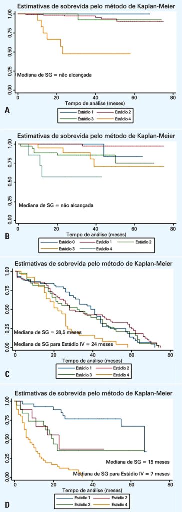 Os tumores mais prevalentes foram de próstata, colorretal, mama e pulmão, com uma grande proporção diagnosticada em estádios iniciais, o que reflete em um grande número de pacientes vivos até o último seguimento.