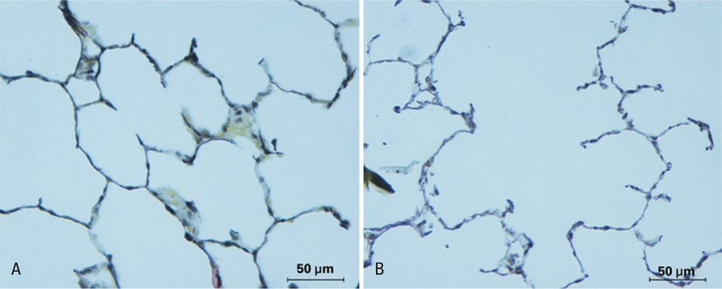 Historicamente, Laennec (1834) descreveu o enfisema pulmonar a partir de observações em cortes necroscópicos superficiais de pulmões humanos, atribuindo a lesão à atrofia do tecido pulmonar resultante da hiperinsuflação pulmonar.() O enfisema foi, então, redefinido como uma “dilatação anormal e permanente dos espaços aéreos distais do bronquíolo terminal”.() Além do mais, a evidência da destruição da parede alveolar e de fibrose não deve ser ignorada na patogenia da doença.()