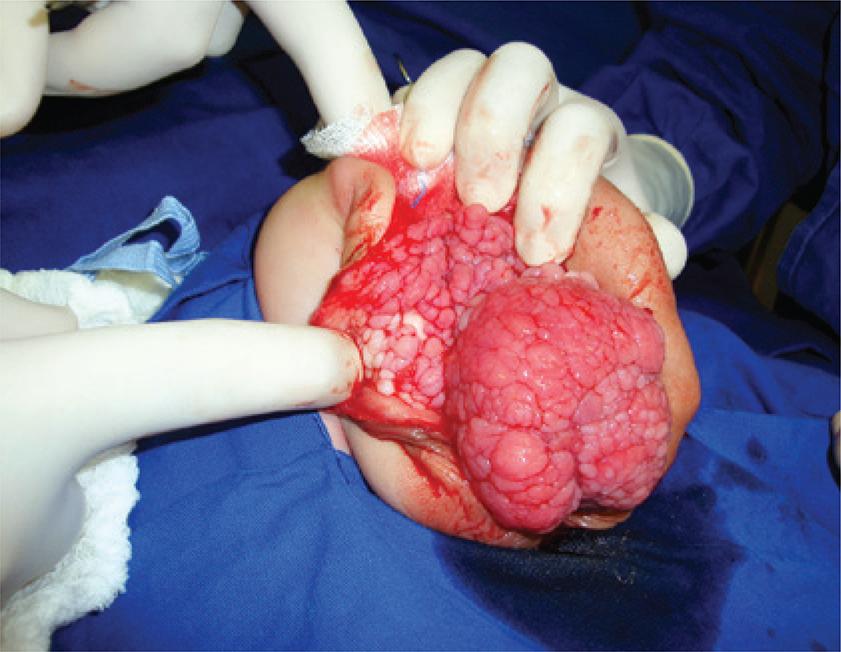 Recém-nascido a termo do sexo masculino encaminhado ao nosso serviço por anomalia anorretal e anomalias perineais externas. O exame físico revelou massa perineal epitelizada, com orifícios cutâneos que apresentavam saída de urina, musculatura perineal hipotrófica, pé torto congênito bilateral, uretra hipospádica, criptorquidia bilateral com testículos não palpáveis e ânus imperfurado. Logo após o nascimento, o paciente foi submetido à colostomia. Aos 3 meses de idade, a criança foi submetida à excisão da massa perineal, orquidopexia bilateral, neouretroplastia a Duplay e anastomose coloanal. A análise anatomopatológica da massa perineal indicou hamartoma.