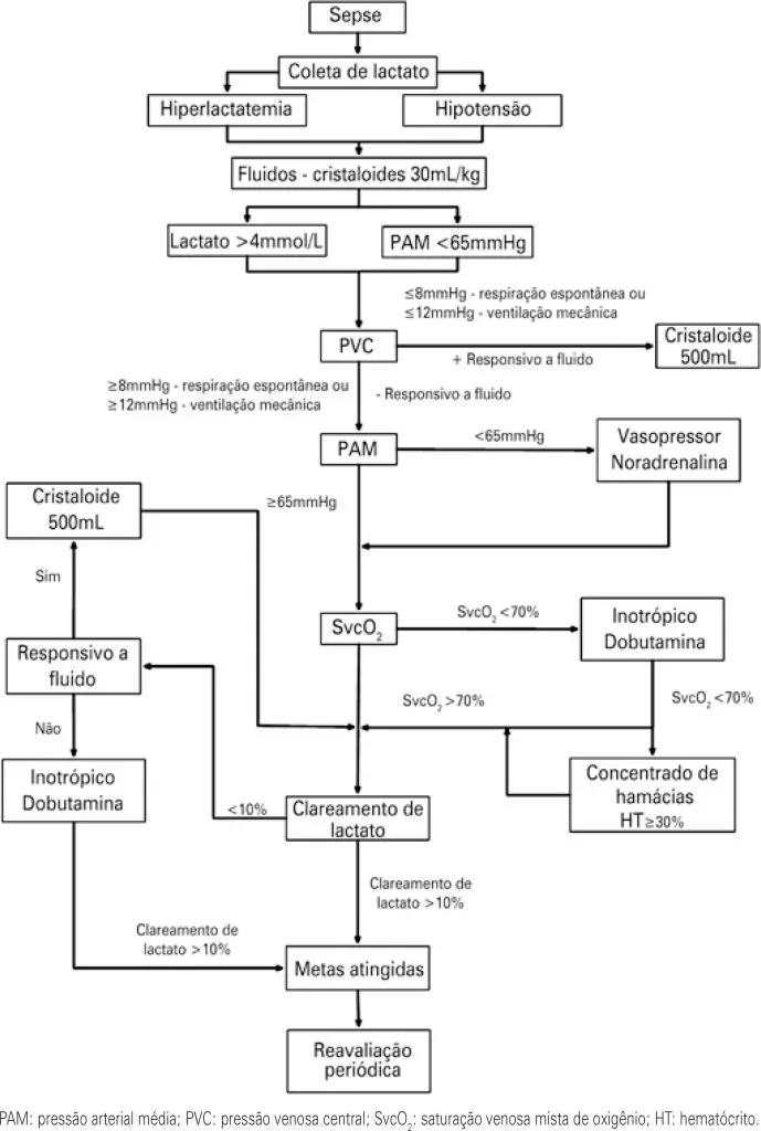 O reconhecimento e o tratamento precoce da sepse grave e do choque séptico é a chave para o sucesso terapêutico. Quanto maior o atraso no início do tratamento, pior é o prognóstico, em decorrência da hipoperfusão tecidual persistente, e do consequente desenvolvimento e agravamento das disfunções orgânicas. Um dos principais mecanismos responsáveis pelo desenvolvimento da disfunção celular é a hipóxia. A adequação do fluxo sanguíneo tecidual e, consequentemente, da oferta de oxigênio à demanda metabólica, de acordo com a avaliação do índice cardíaco e da taxa de extração de oxigênio, deve ser realizada durante a ressuscitação, principalmente nos pacientes de alta complexidade. Novas tecnologias, de fácil manuseio à beira do leito, e novos estudos, que avaliem diretamente o impacto da otimização dos parâmetros macro-hemodinâmicos na microcirculação e no desfecho clínico dos pacientes sépticos, são necessários.