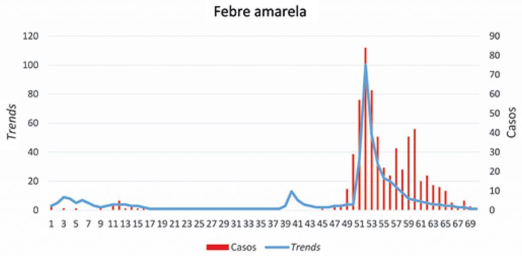 A incidência de dengue e febre amarela no estado de São Paulo apresentou forte correlação com a popularidade de seus termos medidos pelo Google Trends em períodos semanais. A ferramenta Google Trends forneceu alerta precoce, com alta sensibilidade, para a detecção de surtos dessas doenças.